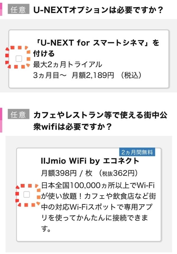 👉 ここが第2の罠じゃ!「U-NEXT」や「公衆Wi-Fi」などのオプション選択画面が出る。