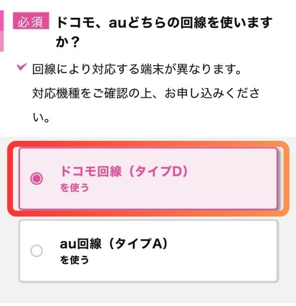 迷ったら「ドコモ回線タイプD)」を選んでおけば間違いはない