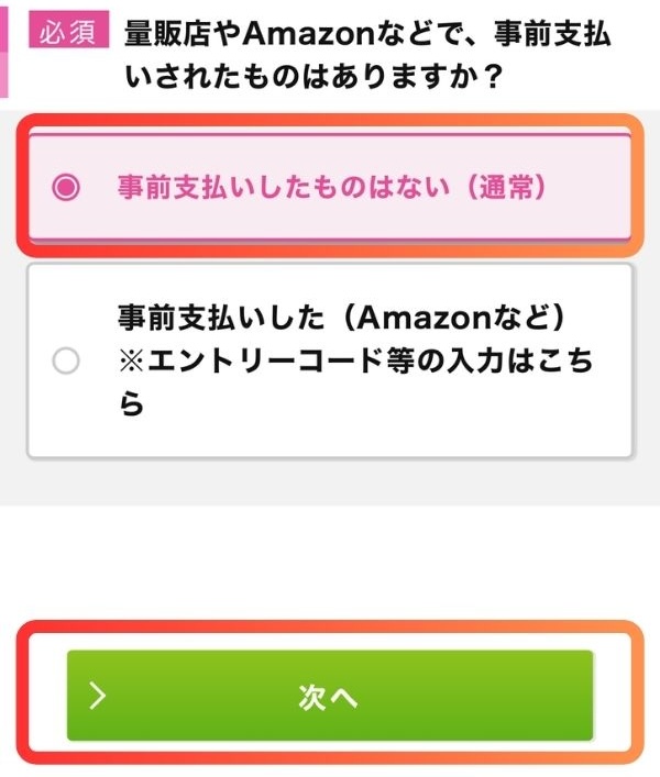 お主は普通に申し込むから、「事前支払いしたものはない」を選べばOKじゃ。